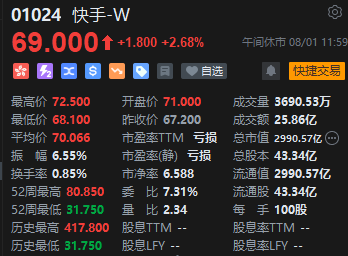 快手发盈喜一度涨约7%,后涨幅缩窄至2.86%。快手昨晚发盈喜公告称,截至2023年6月30日止6个月,预期快手录得的集团层面净利润不低于人民币5.6亿元,实现大幅扭亏为盈,去年同期集团录得的净亏损约为人民币94.3亿元。另外,2023年7月31日快手注销406.25万股回购股份。