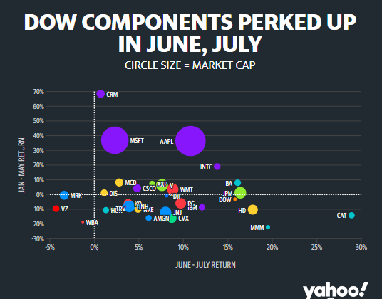 下图中的x轴反映了道指30个成分股在6月至7月的最新回报情况,而y轴则展示了今年前5个月的涨跌幅。