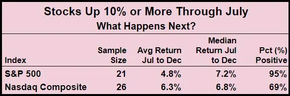 从历史规律看,美股在年内前七个月录得的强劲升势,对于年内余下时间的表现,往往是一个好的征兆。追溯到1960年的统计显示,当标普500指数全年前七个月的涨幅超过10%时,其在8月-12月中仍有95%的情况能继续上涨,平均涨幅达到了4.8%。
