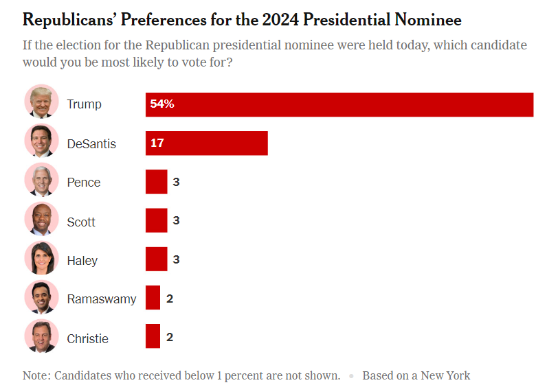 根据本周一发布的民调,在共和党选民中,特朗普的支持率达到54%,德桑蒂斯的支持率只剩17%。至于彭斯、黑莉这些“其他候选人”,支持率加起来还没有德桑蒂斯高。