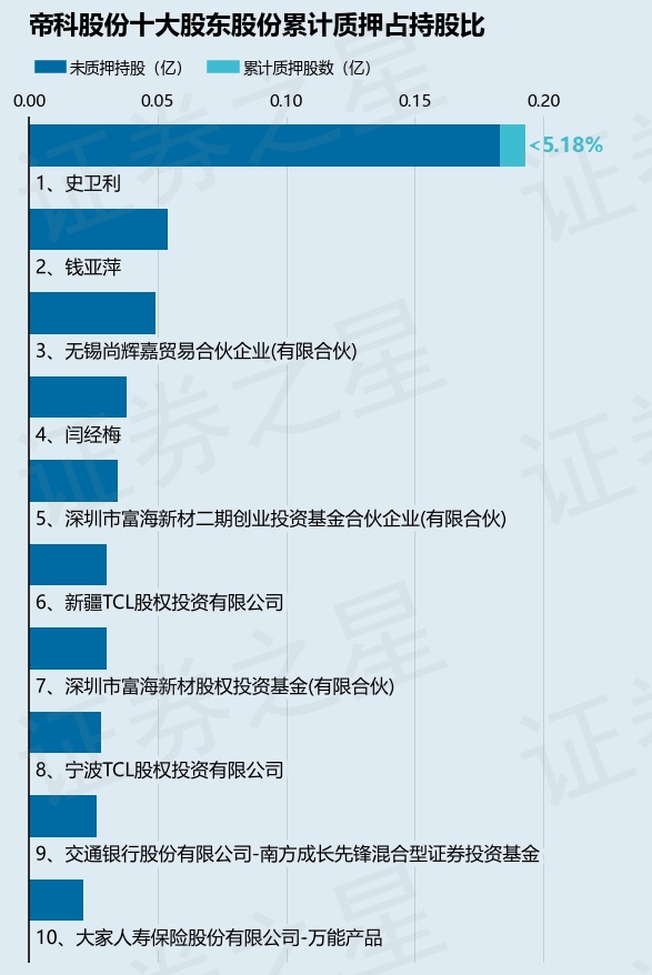 截止本公告日,股东史卫利已累计质押股份100.0万股,占其持股总数的5.18%。本次质押后帝科股份十大股东的累计质押股份占持股比例见下图: