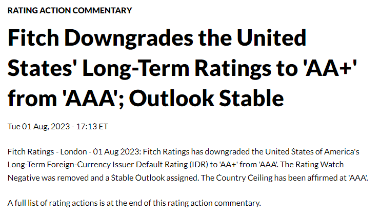 我对下调评级的时机感到惊讶,因为我不明白他们(惠誉)现在掌握的信息怎么会比债务上限危机解决前更糟糕。在债务上限危机解决之前,他们曾将美国列入负面观察名单,但从那以后,我们在财政前景方面其实得到了很多好消息。我还感到困惑的是,下调评级的动机似乎与财政轨迹有关,但这一切都很好。除非他们认为财政轨迹表明存在违约风险(我认为他们不会这么说),否则我不理解其中的原因。