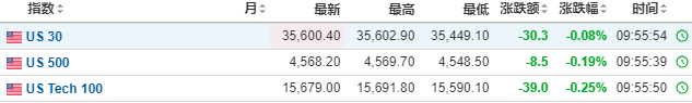 在股市方面,美国三大股指期货在美股盘后虽有所下跌,但跌幅尚属可控的范围内。其中,道琼斯工业股票平均价格指数期货下跌34点,跌幅0.09%。标准普尔500指数和纳斯达克100指数期货分别下跌0.19%和0.25%。