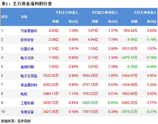 从两市行业板块资金流向来看,汽车零部件板块获主力资金净流入4.03亿,软件开发板块获主力资金净流入2.29亿,仪器仪表板块主力资金净流入2.10亿,电子元件行业主力资金净流入1.76亿,造纸印刷板块主力净流入1.52亿。