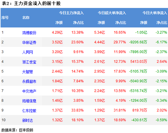 从两市个股主力资金流向来看,鸿博股份获主力资金净流入4.29亿,华林证券获主力资金净流入3.52亿,人民网获主力资金净流入3.20亿,浙江世宝获主力资金净流入3.15亿,大智慧获主力净流入2.44亿。