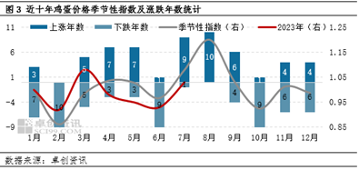 通过分析过去十年数据发现,鸡蛋价格具有明显的周期性和季节性特点,2023年以来的走势也基本符合季节性规律。从季节性发展规律来看,8月份继续上涨的概率较大。因今年中秋节在9月末,需求支撑下9月中上旬鸡蛋价格或仍有上涨空间,下旬随着需求减弱或高位下滑。