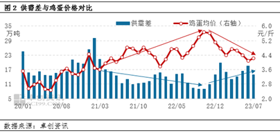 供需关系是驱动鸡蛋价格变化的最主要因素,我们可以通过供需差对供需关系进行量化分析。通过数据分析得出,月度供需差与月度产区鸡蛋价格的相关性系数为-0.62,属于中度负相关关系,即两者表现为反向变化的趋势,当供需差扩大,蛋价下跌,供需差缩小,蛋价则上涨。当前鸡蛋供应量仍处于近年相对低位,对鸡蛋价格起到较强支撑作用;7月中下旬开始,随着南方市场逐渐结束梅雨季节,终端及贸易环节的采购积极性增加,市场呈现供不应求的状态,供需差开始收缩,鸡蛋价格季节性反弹。(备注:供应量是综合在产蛋鸡存栏量、产蛋率及期初库存等指标得出,需求量是综合批发市场销量及食品厂初级加工量得出)