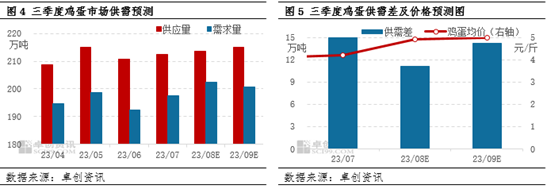 综合来看,三季度需求量或增长至年内高位,因此将带动鸡蛋价格涨至年内较高水平,8月份或出现年内价格最高点。但由于供应量持续增加,预计三季度鸡蛋均价或不及去年同期,初步预计最高价或涨至5.30-5.50元/斤。