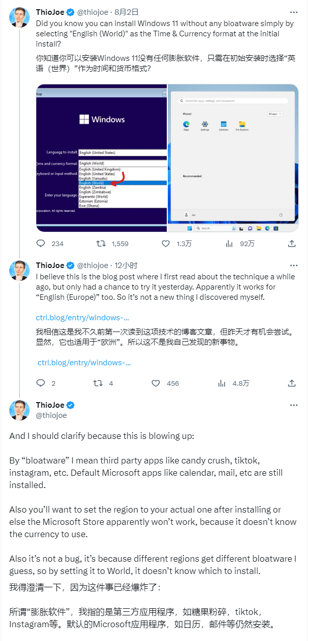 @ThioJoe 发现在安装 Win11 系统过程中,在“时间和货币格式”下选择“英语(全球)”之后,不会预装 TikTok、Instagram、ESPN、Spotify 等应用程序。