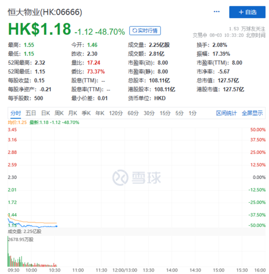 8月3日上午,恒大物业复牌恢复交易,以1.46港元/股开盘,大跌36.52%。开盘后股价持续走低,盘中最低股价达到1.15港元,跌幅50%。