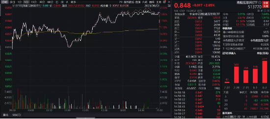 8月3日,港股早盘弱势震荡,午后冲高回落,互联网板块逆市走强。重手聚焦港股互联网龙头股的港股互联网ETF(513770)午后持续攀升,场内价格逆市大涨2.05%,成交额3.44亿元。