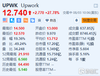 格隆汇8月3日丨自由职业平台Upwork Inc.( UPWK.US)大涨27.78%,报12.74美元,盘初一度暴涨超45%。Upwork第二季度营利1.686亿美元,同比增长7%,市场预期1.625亿美元;调整后每股收益0.1美元,较去年同期每股亏损0.04美元扭亏为盈。指引方面,公司预计Q3营收1.65亿美元-1.7亿美元,调整后每股收益0.09-0.11美元。