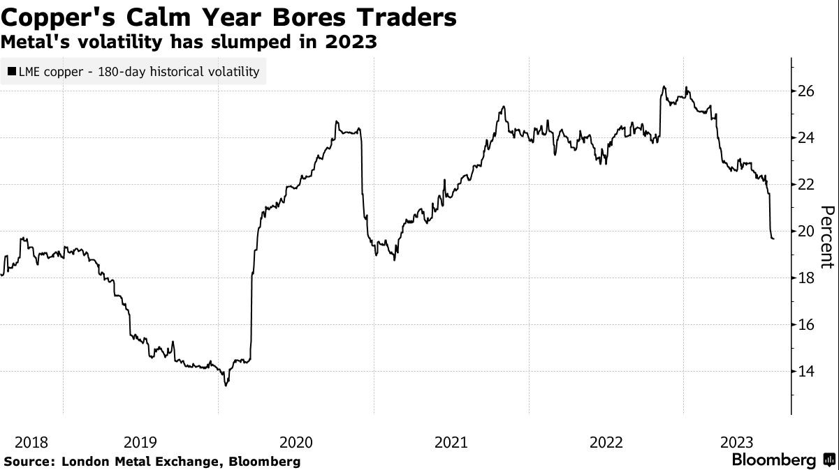 与此同时,收紧的货币政策给铜、铝和黄金等主要市场带来了压力。一些知情人士称,对冲基金今年流行的一种策略是买入铜期货看涨期权,如果铜价升至给定水平以上,这种策略可以获得丰厚回报。但缺乏波动性意味着,这样的押注将让交易员蒙受损失。