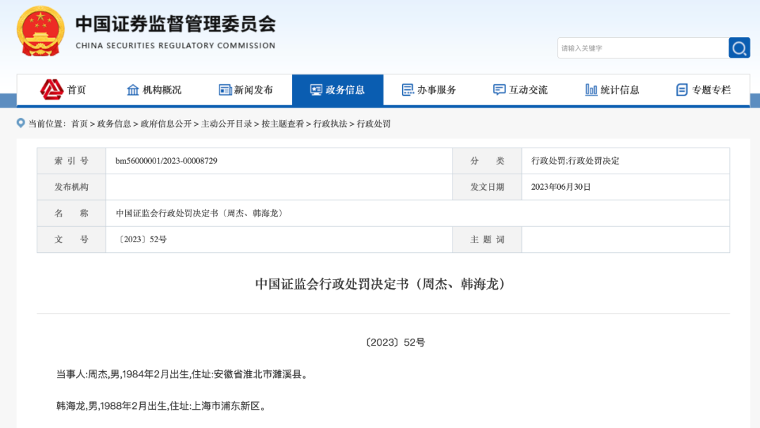 最终,根据当事人违法行为的事实、性质、情节与社会危害程度,依据《证券法》第一百九十二条的规定,证监会决定:没收周杰、韩海龙违法所得4880万元,并处以9761万元罚款,其中对周杰处以9273万元元罚款,对韩海龙处以488万元罚款。