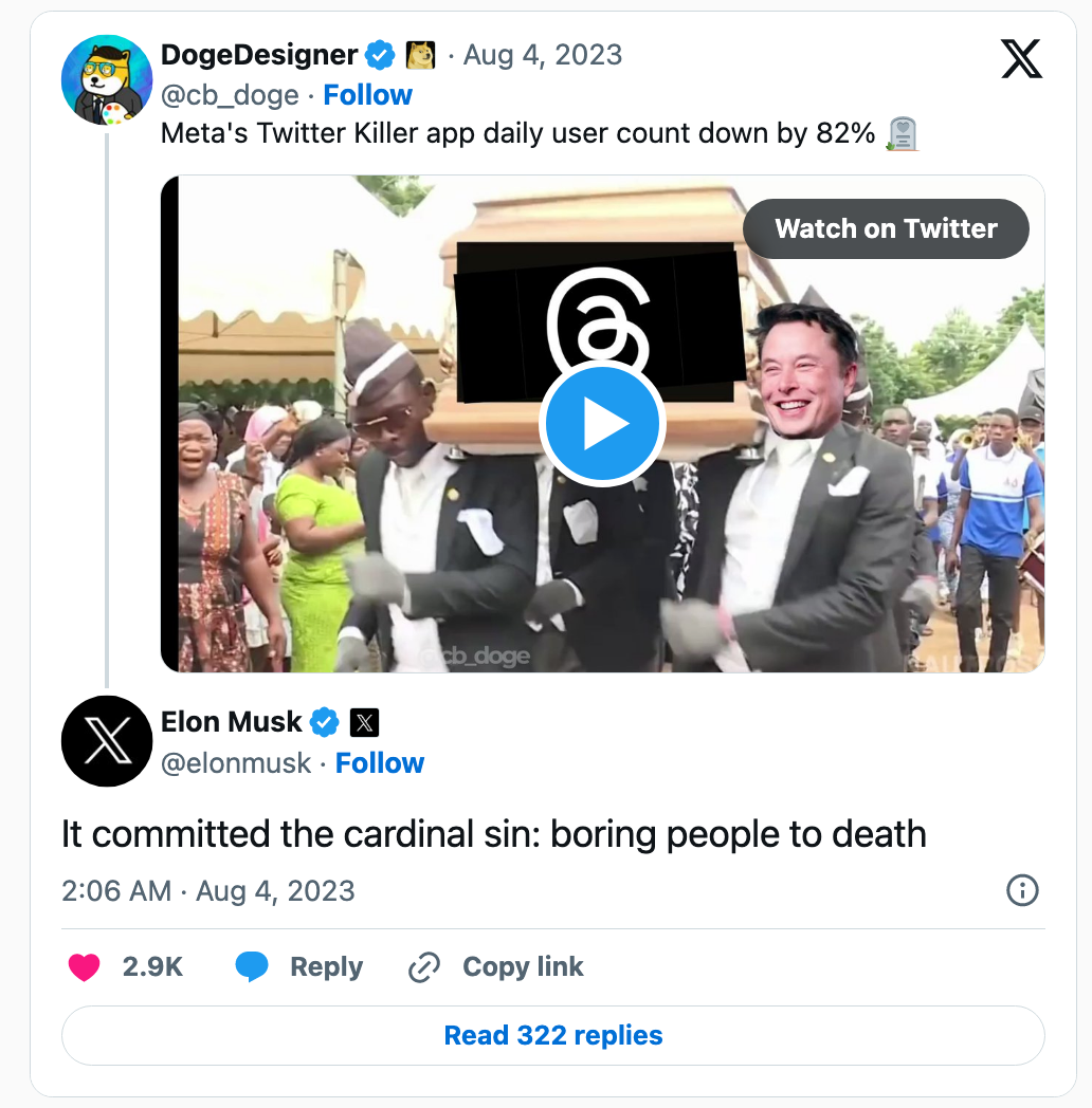 对此,马斯克回应称:“它(Threads)犯了大罪:让人无聊至死。”