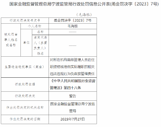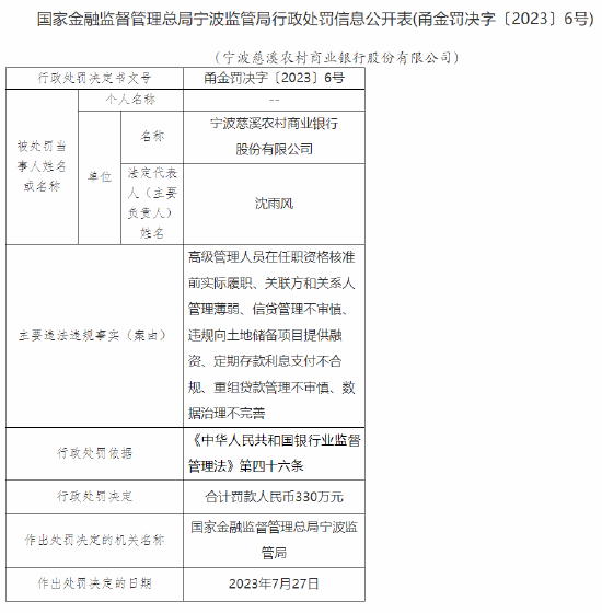 8月4日金融一线消息,据国家金融监督管理总局网站发布的行政处罚信息公开表显示,宁波慈溪农村商业银行股份有限公司因高级管理人员在任职资格核准前实际履职、关联方和关系人管理薄弱、信贷管理不审慎、违规向土地储备项目提供融资、定期存款利息支付不合规、重组贷款管理不审慎、数据治理不完善,被处以罚款330万元;此外,毛海雅因对上述高级管理人员在任职资格核准前实际履职行为负直接管理责任,被处以警告;陈文杰因对违规向土地储备项目提供融资行为负直接管理责任,同样被处以警告。