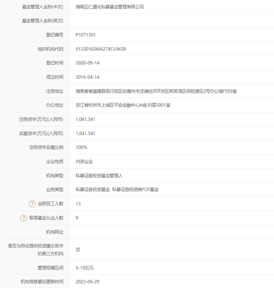 中基协备案信息显示,正仁量化成立于2016年4月,2020年9月备案。现有13名员工,其中9名取得基金从业资格。存续产品25只,管理规模在5亿元到10亿元区间。