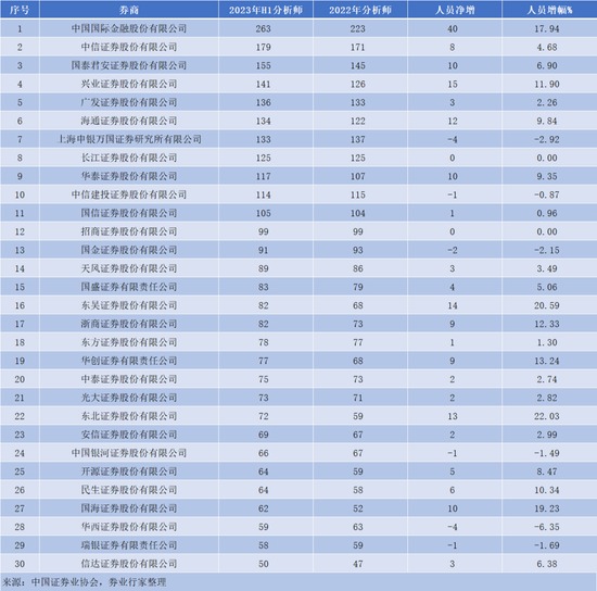在证券分析师数量方面,中金公司以263名居首,并且增幅达到17.94%。中信证券和国泰君安分别为179名和155名,增幅分别为4.68%和6.90%。兴业证券、广发证券、海通证券、申万宏源、长江证券、华泰证券、中信建投和国信证券均超过百名。