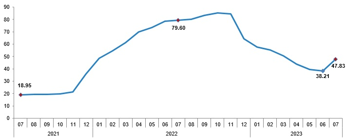 昨日公布的数据显示,土耳其7月CPI年率从6月的38.21%升至47.83%,结束了连续八个月的回落,另外,CPI环比上升了9.49%,创下1997年以来的最高月度涨幅。