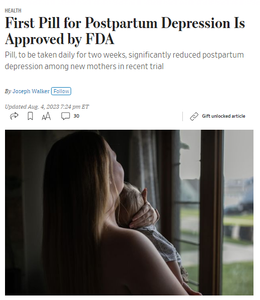首款口服抗产后抑郁新药,第15天能看到患者症状改善