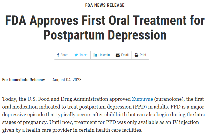 FDA精神药物主任Tiffany Farchione博士在一份声明中称:“产后抑郁症是一种严重的、可能危及生命的疾病,在这种情况下,女性会感到悲伤、内疚、毫无价值,在严重的情况下,甚至会想到伤害自己或孩子。此外,因为产后抑郁症会破坏母婴关系,也会对婴儿的身体和情感发展产生影响。对于许多女性来说,获得口服的抗抑郁药物将是一个有益的选择,可以应对极端的、有时危及生命的情绪。”
