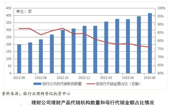 从代销渠道拓展情况来看,上半年理财公司理财产品由母行代销金额占比进一步下降。剔除母行代销的情况,理财公司合作代销机构数量逐步上升,6月有417家机构代销了理财公司发行的理财产品,较年初增加89家。