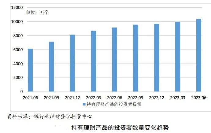 2023年上半年,理财投资者数量维持增长态势。截至6月末,持有理财产品的投资者数量已突破1亿,达1.04亿个,较年初增长7.24%,同比增长13.41%。其中,个人投资者数量新增679.06万个,机构投资者数量新增21.38万个。
