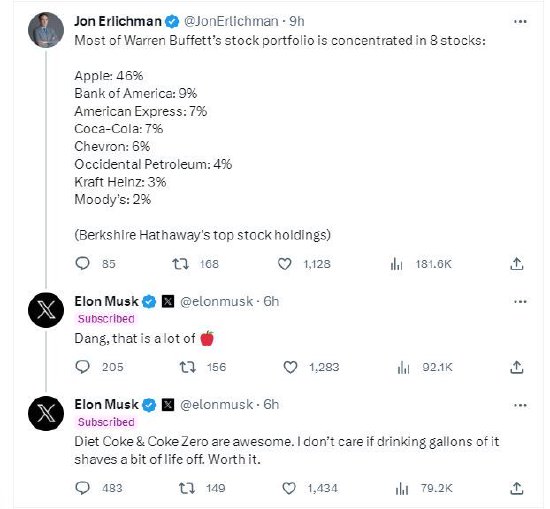 美国财经主播Jon Erlichman在马斯克旗下X平台上发帖称:“沃伦·巴菲特的大部分股票投资组合集中在8只股票上: