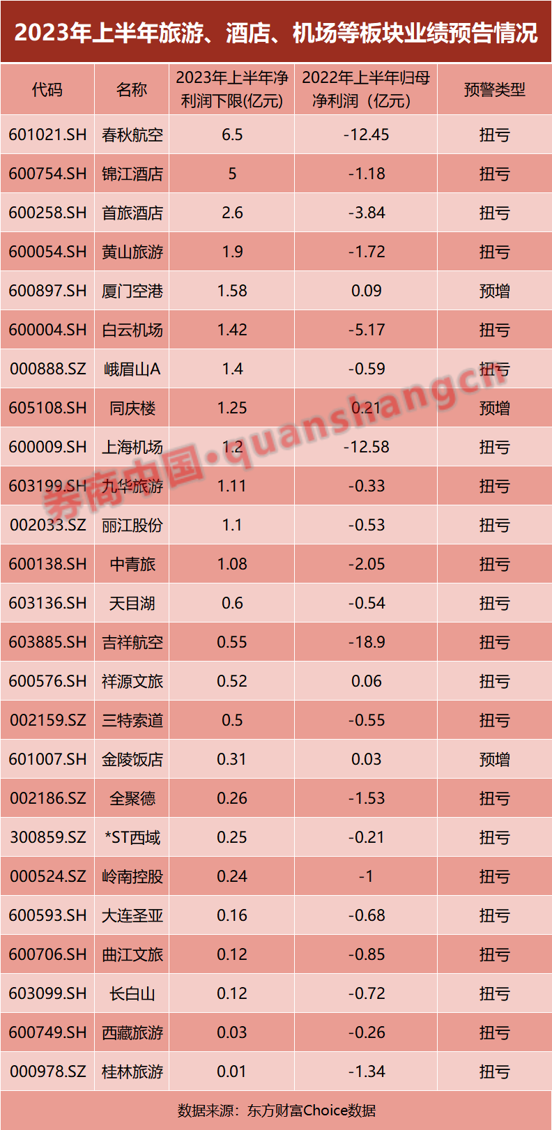 券商中国记者注意到,在强劲的旅游出行需求下,今年以来,包括酒店餐饮、机场航空、旅游景区等板块的企业业绩强势回暖,已有25家A股上市公司上半年业绩预增或扭亏。券商亦普遍看好相关板块机会,认为三季度在成都大运会、杭州亚运会以及暑期/毕业季出行需求带动下,会有亮眼表现。
