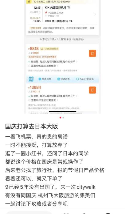 以日本旅游为例,券商中国记者在社交平台上注意到,近期不少网友发帖称,国庆打算去日本,但是机票往返价格高达七八千元,甚至个别日期在10000元以上。