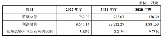 据招股书中披露,期内董事、监事、高级管理人员及核心技术人员薪酬,发生额分别为378.39万元、723.07万元、762.08万元,占当期利润总额的9.75%、2.21%、3.88%。