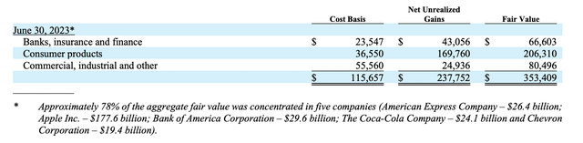 财报数据显示,截至2023年二季度末,伯克希尔持仓市值居前的五只股票分别为苹果、美国银行、美国运通、可口可乐、雪佛龙,持仓市值分别为1776亿美元、296亿美元、264亿美元、241亿美元、194亿美元。这五只股票的持仓占其投资组合的78%。