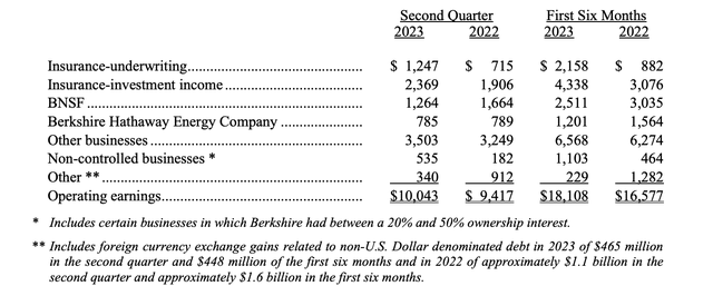 而为净利润大幅攀升作出重要贡献的是投资收益的大幅增加。财报显示,伯克希尔二季度股权证券持仓的投资收益为242亿美元,整个上半年收益为476亿美元。而2022年同期,伯克希尔“炒股”巨亏530亿美元,去年上半年损失了538亿美元。