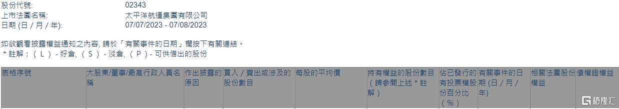 格隆汇8月7日丨根据联交所最新权益披露资料显示,2023年8月1日,太平洋航运(02343.HK)获JPMorgan Chase & Co.以每股均价2.2579港元增持好仓1821.37万股,涉资约4112.5万港元。