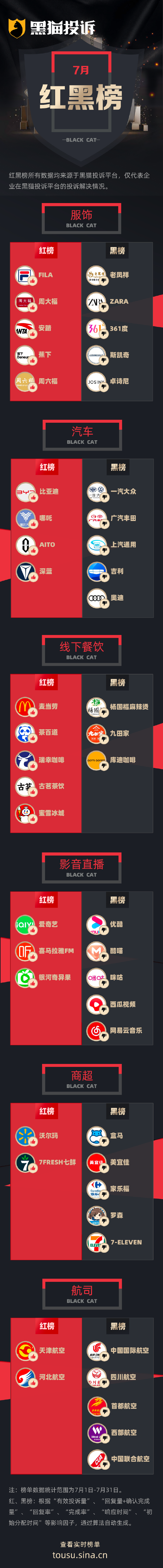 黑猫投诉【投诉入口】发布7月份企业投诉处理红黑榜单,数据均来源于黑猫投诉平台,反映了企业在黑猫投诉平台的投诉处理解决情况。
