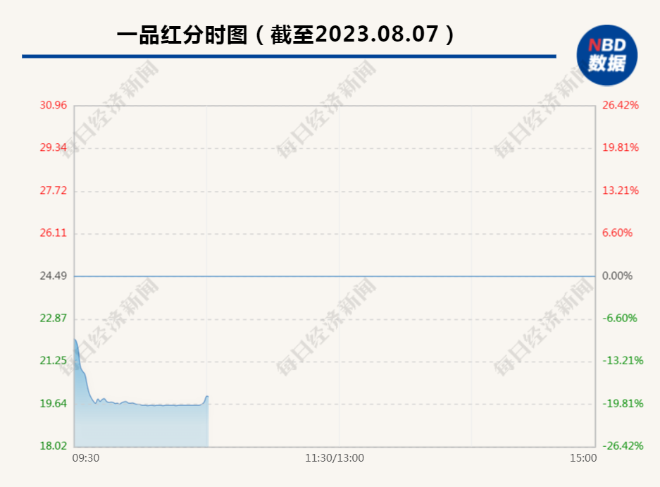 一品红(SZ300723)一度20CM跌停。截至发稿,一品红报19.84元/股,跌幅18.99%,市值90.1亿元。