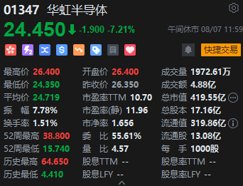 华虹半导体跌超7%,消息面上,华虹公司正式登陆科创板,每股发行价为52元。