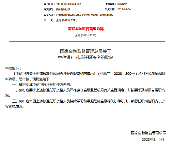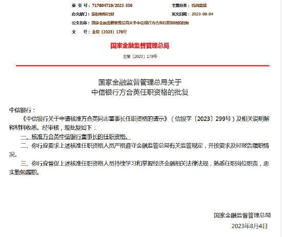 8月7日金融一线消息,国家金融监督管理总局网站发布批复文件显示,核准方合英中信银行董事长、刘成中信银行行长的任职资格。