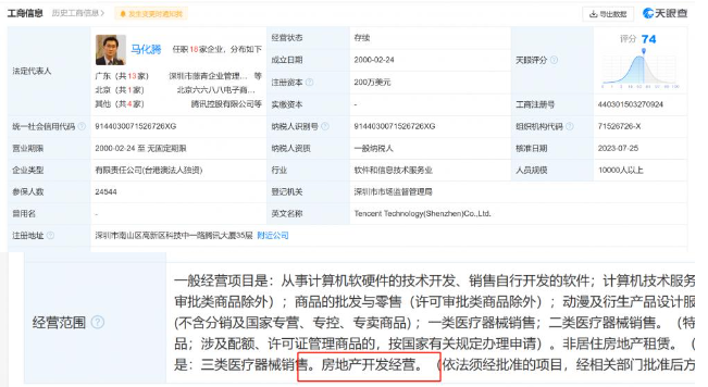 今年7月26日,天眼查App显示,近日,腾讯科技(深圳)有限公司发生经营范围工商变更,其中,许可经营项目新增房地产开发经营,一般经营项目新增非居住房地产租赁。
