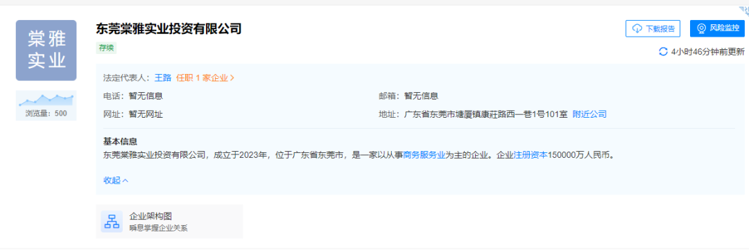 企查查、天眼查等App显示,8月3日,东莞棠雅实业投资有限公司成立,注册资本15亿人民币,法定代表人为王路,经营范围包含住房租赁、非居住房地产租赁、园区管理服务、工程管理服务、房地产开发经营。