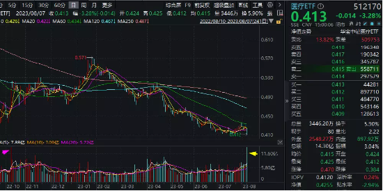 医疗ETF(512170)复制中证医疗走势,全天低开低走,收盘场内价格跌3.28%,为逾9个月来最大单日跌幅,收盘价报0.413元,再创逾三年新低!