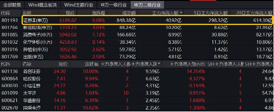 值得注意的是,今日主力资金再度增仓申万二级证券板块40.92亿元,净流入额高居所有申万二级行业首位,伴随着近期券商板块持续上攻,主力资金增持趋势不改,近5日、20日增仓额均位于所有申万二级行业首位,足见对券商行情持续性的看好。