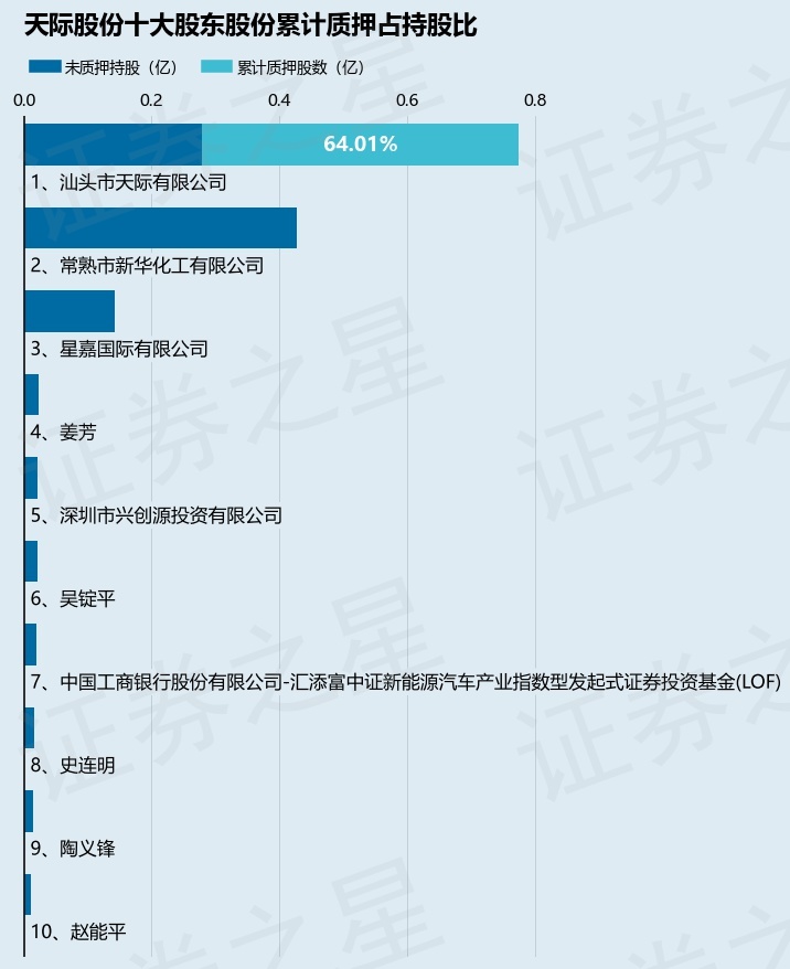 截止本公告日,股东汕头市天际有限公司已累计质押股份4956.61万股,占其持股总数的64.01%。本次质押后天际股份十大股东的累计质押股份占持股比例见下图: