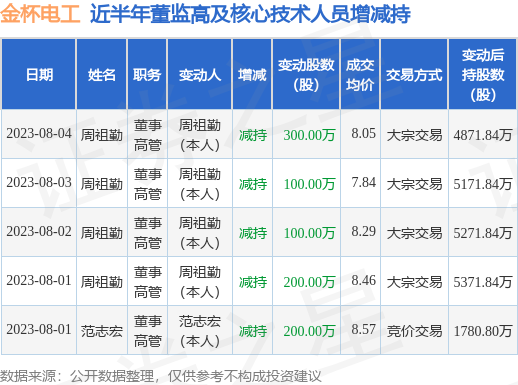 金杯电工近半年内的董监高及核心技术人员增减持详情如下: