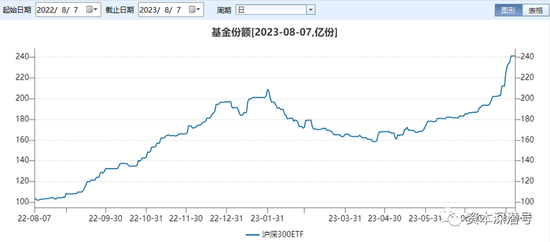 从WIND的统计图(下图,截至8月初)可以发现,华泰柏瑞300ETF近期的规模涨势迅速。