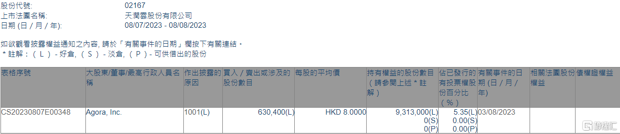 格隆汇8月8日丨根据联交所最新权益披露资料显示,2023年8月3日,天润云(02167.HK)获Agora, Inc.在场内以每股均价8.0港元增持63.04万股,涉资约504.32万港元。
