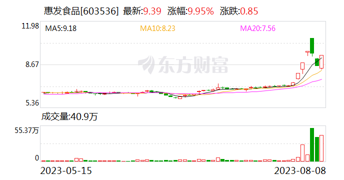 证券时报网讯,惠发食品再度涨停,6个交易日内录得4个涨停,累计涨幅为28.98%,累计换手率为70.76%。截至13:59,该股今日成交量3961.16万股,成交金额3.48亿元,换手率16.19%。最新A股总市值达22.97亿元。