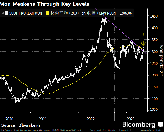Meritz Securities经济学家Park Sooyeon表示,“不确定性包括本周晚些时候公布的美国通胀数据,以及杰罗姆·鲍威尔在8月底杰克逊霍尔会议上的讲话”,这些都加剧了风险厌恶情绪,并可能拖累韩元。