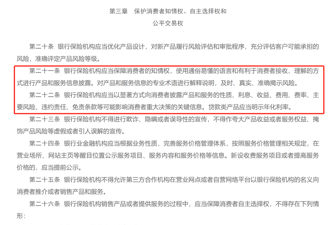 此外,第二十二条规定,银行保险机构应当以显著方式向消费者披露产品和服务的性质、利息、收益、费用、费率、主要风险、违约责任、免责条款等可能影响消费者重大决策的关键信息。贷款类产品应当明示年化利率。