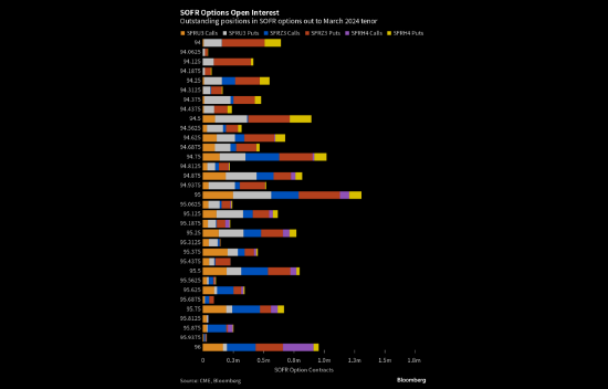SOFR期权本周的走势表明,存在对冲明年底乃至2025年的下行风险的需求。特别是2024年12月和2025年12月期权在周一和周二成为了目标,相关押注将受益于美联储利率维持高位时间拉长,以及市场随之下调对明年起降息幅度的预期。
